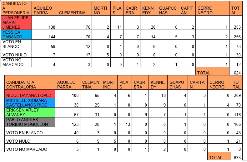 A continuación, la tabla de candidatos que se postularon para ocupar el cargo de personero y contralor estudiantil: